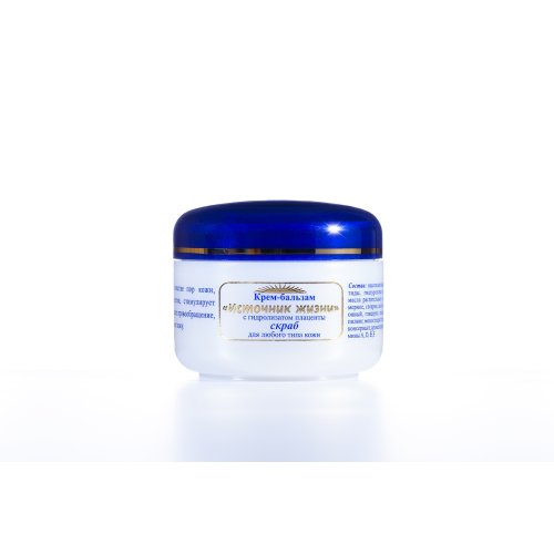 Крем-бальзам скраб содержит гидролизат плаценты (высокоактивные пептиды, мукополисахариды, аминокислоты, гиалуроновую кислоту), масла растительные и парфюмерное, воск эмульсионный, глицерин, стеарин, витамины A, D, E, F, полимерный пилинг, ароматизатор.