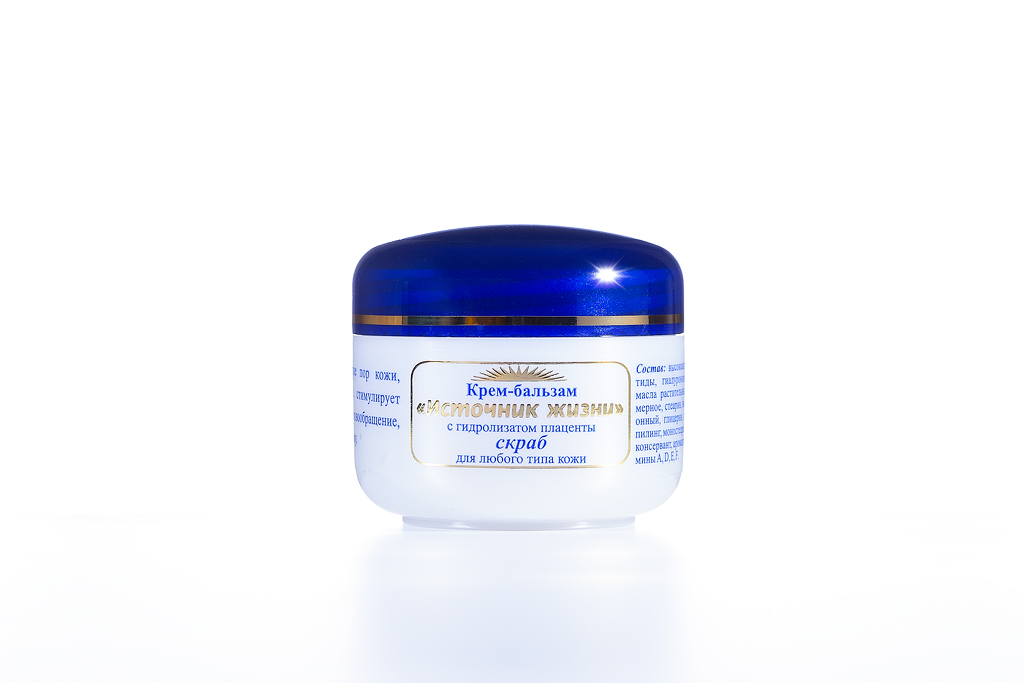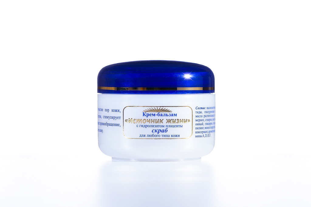 Применение скраба «Источник жизни» усиливает естественный пилинг (отшелушивание). Крем-бальзам скраб содержит гидролизат плаценты (высокоактивные пептиды, мукополисахариды, аминокислоты, гиалуроновую кислоту), масла растительные и парфюмерное, воск эмульсионный, глицерин, стеарин, витамины A, D, E, F, полимерный пилинг, ароматизатор.